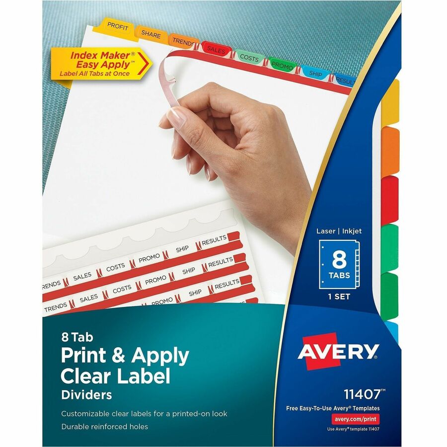 | Marketing Information | Make professional-looking dividers with your own tab titles. Label all tabs at once with Easy Apply clear labels. Perfectly align tab labels and label multiple sets quickly with Easy Apply label strips. Label sheet for labeling tabs individually is included in every pack. Format the clear tab labels using your existing software and inkjet or laser printer. Avery offers many easy-to-use templates for Microsoft Word and other popular software programs. Great for larger projects requiring more than one divider set. Three-hole punched dividers have a reinforced binding edge and are designed for use with three-ring binders. |