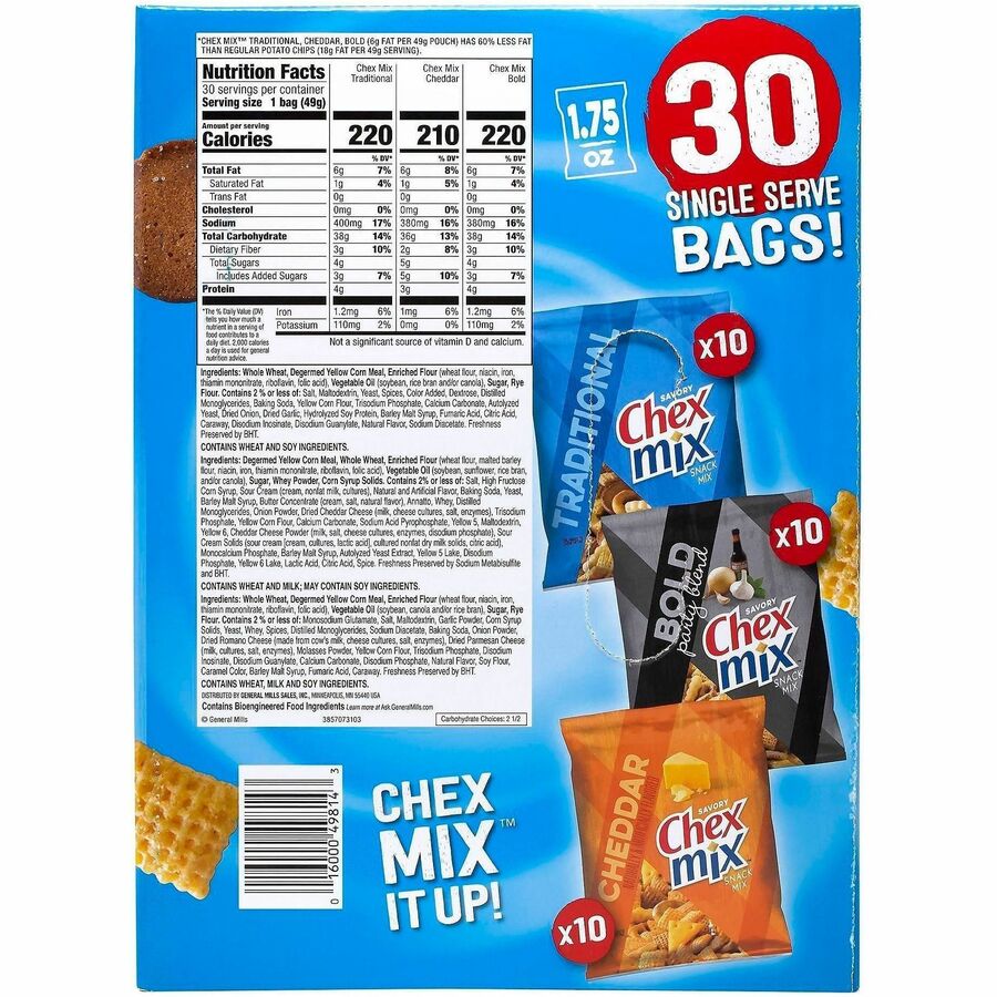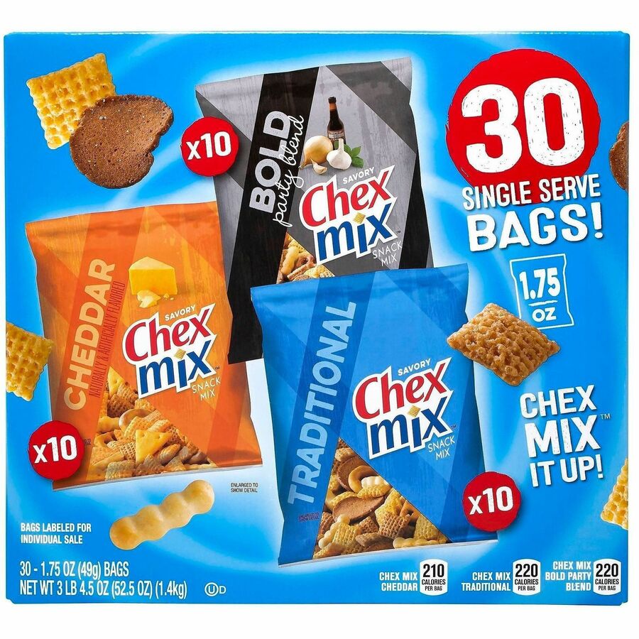 Original Chex Mix offers a classic flavor that packs a punch. Corn Chex, Wheat Chex, pretzels, rye chips and mini breadsticks make up unique snack where no bite is ever the same. Classic seasoning blend completely covers each piece for a flavor-packed bite. Delicious mix is perfect for road trips, parties and after-school snacks. |