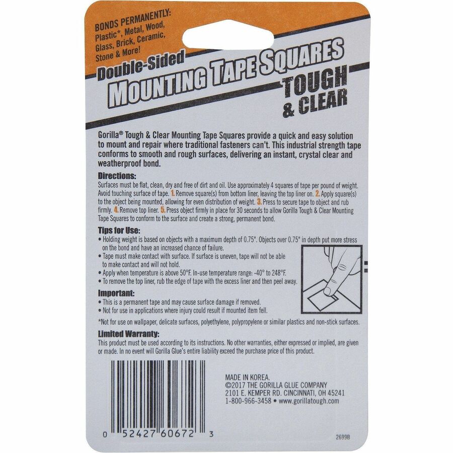 | Marketing Information | Double-sided mounting tape squares mount in an instant for a long-lasting, reliable bond. Industrial-strength design creates a heavy-duty bond that holds up to 7 lb. Weatherproof construction ensures reliable performance both indoors and out. Mounting tape is perfect for applying to plastic, metal, wood, glass, brick, ceramic, stone and more. |