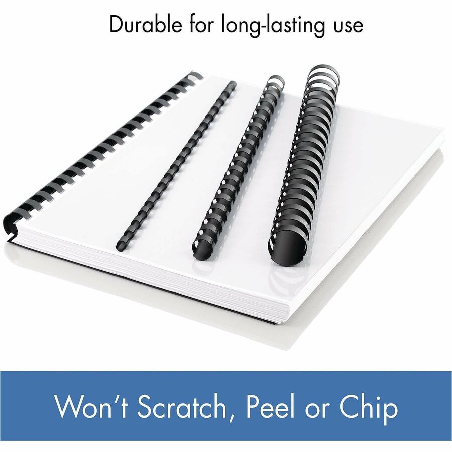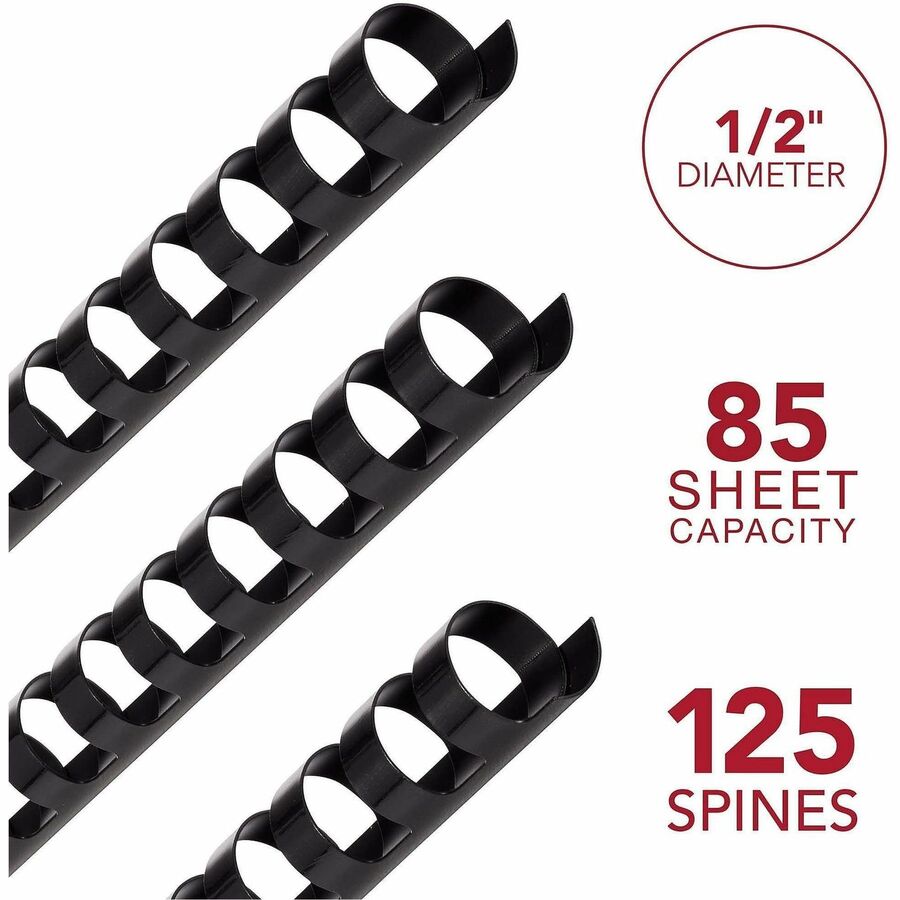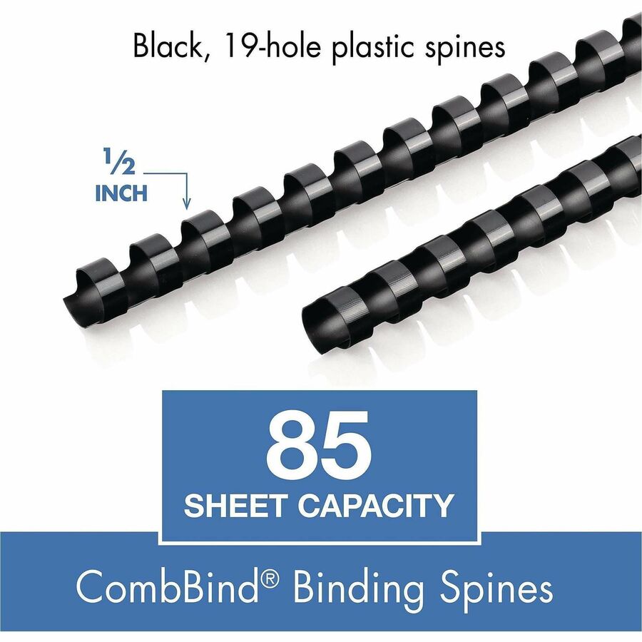 | Marketing Information | Once you have your binding covers picked out, use these binding spines to keep your documents and presentations neatly bound. Durable construction ensures that your finished document is both fully functional and long-lasting. Permanent spines allow your pages to lie flat to keep them manageable and easy-to-read. Sturdy plastic material will not scratch, peel, chip or discolor for lasting durability. 1/2" spine binds up to 85 letter-size sheets. 19-hole binding spines are designed for any comb-style binding machine (sold separately). |