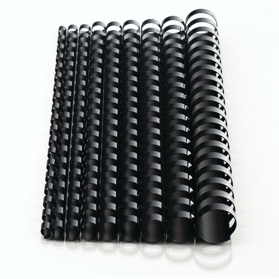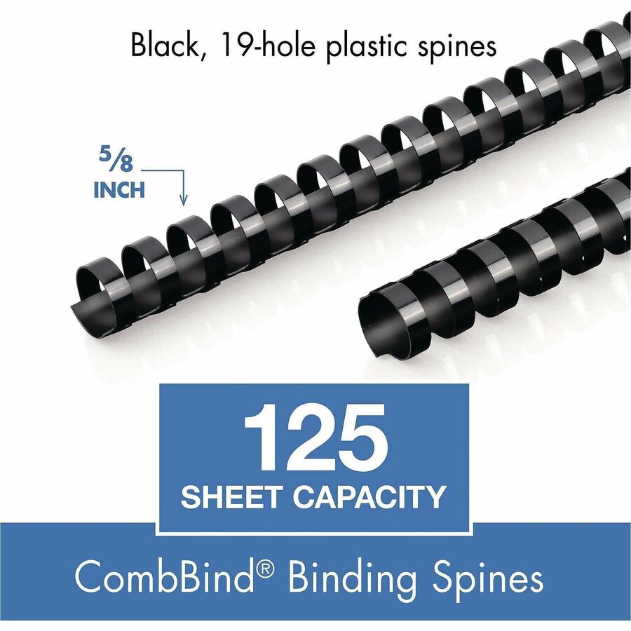 | Marketing Information | Once you have your binding covers picked out, use these binding spines to keep your documents and presentations neatly bound. Durable construction ensures that your finished document is both fully functional and long-lasting. Permanent spines allow your pages to lie flat to keep them manageable and easy-to-read. Sturdy plastic material will not scratch, peel, chip or discolor for lasting durability. 5/8" spine binds up to 125 letter-size sheets. 19-hole binding spines are designed for any comb-style binding machine (sold separately). |