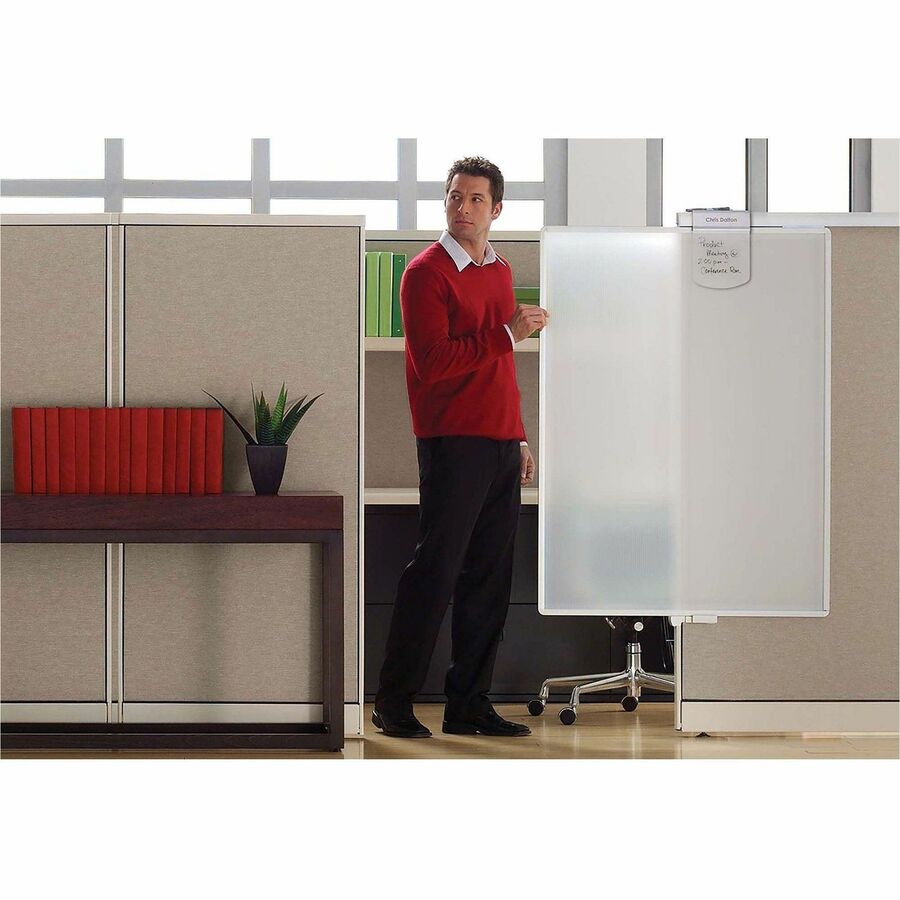 | Marketing Information | Lightweight, translucent plastic screen glides open and close to provide a private space in a cubicle environment. Mount the screen to standard-sized 65" high cubicles that are 1-1/4" to 3-1/4" thick. Privacy screen includes nameplate and dry-erase board for messages. Privacy screen is made of translucent plastic panels and a silver aluminum frame. |